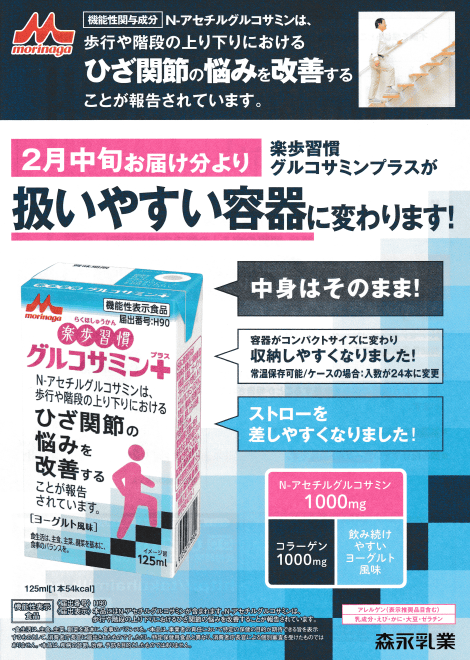 森永乳業から発売されている「楽歩習慣グルコサミン+」が2月中旬お届け分よりリニューアル致します。
